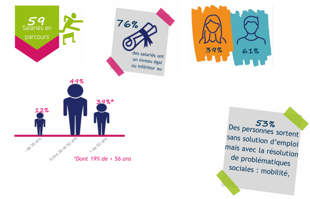 Une équipe de 12 personnes représentant 10,67 équivalents temps plein accompagne chaque année près de 260 personnes sur l’ensemble des actions (dont 40 salariés en parcours d’insertion au sein de l’entreprise sociale apprenante).